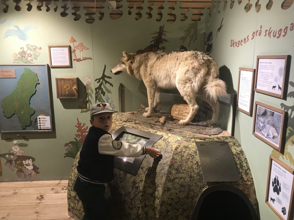 Selbst in den dichter besiedelten Ecken dieses großen Landes gibt es immer wieder die spannenden Suchen nach tollen Spielplätzen und kleinen Oasen. Und ja, auch IKEA bietet kostenlosen Kinderspaß an: in Karlstad am Nordufer von Schwedens größtem See (Vänern) wollen Anton und Edgar unbedingt mal wieder ins Småland. Wir erfüllen ihnen diesen Wunsch und gönnen uns so mal wieder eine Stunde kinderfreie Zeit 😅. Hier in Karlstad gibt es aber auch den Stadtpark „Mariebergsskogen“: ein großes Areal mit verschiedenen Spielplätzen, Freilufttheater, Tiergehegen, Minigolf und Naturkundemuseum „Naturum Värmland“. Der Park ist von 7-22 Uhr geöffnet und die meisten Angebote sind kostenfrei. Auf dem Parkplatz davor gibt es 6 Wohnmobil Stellplätze (bei Bedarf sogar mit Strom für 50 SEK die Nacht). Das Museum im Park ist super geeignet für Familien mit Kindern. Alles wird kindgerecht und spannend zum mitmachen gezeigt.