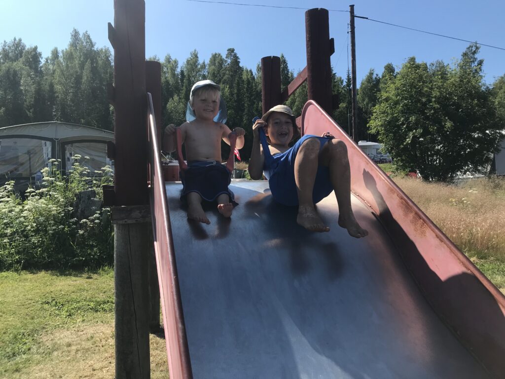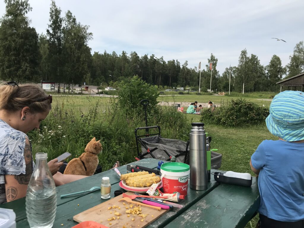 In Sundsvall angekommen, stellen wir uns direkt auf den Parkplatz des Stadtparks Norra Berget. Laut unserer Reiseapps kann man hier auch über Nacht stehen. Der öffentliche und kostenlose Park erwartet uns gleich mit vielen Spielmöglichkeiten für Kinder. Die Jungs nehmen dieses Angebot begeistert an und spielen erstmal ausgiebig, während wir einen Mittagssnack auf einer der vielen Sitzgelegenheiten zu uns nehmen. Janis und Jimi sind mit dabei und unserer Kater ist wieder einmal der absolute Hingucker und Menschenmagnet 😂. Wir können Anton und Edgar überzeugen, noch weiter durch den großen Park zu schlendern. Dieser ist eigentlich ein großes Freilichtmuseum mit alten Bauernhäusern, Tiergehegen, Cafés und Aussichtsturm. Wir nutzen einen der vielen Grillplätze für ein spontanes Abendbrot unter freiem Himmel bei sommerlichen Temperaturen 👍🏻. Als musikalische Begleitung tanzt eine Gruppe Linedancer im lokalen Pavillon 😅. Herrlicher entspannter Sommerabend!