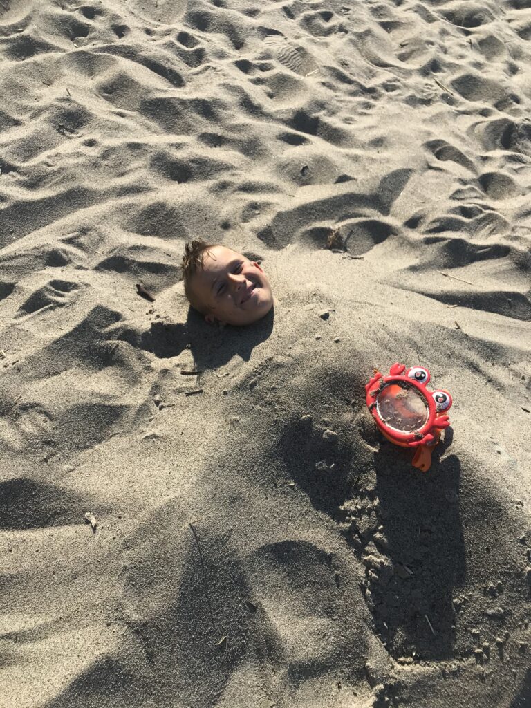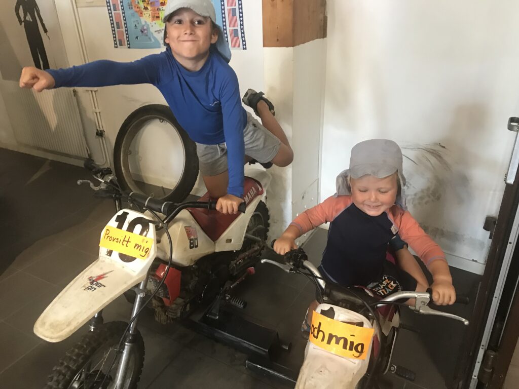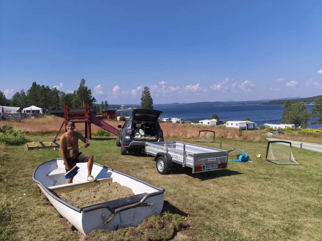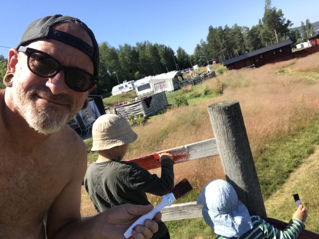 Anne beweist einmal mehr ihr Gespür für gute Ideen und Möglichkeiten: sie fragt spontan beim örtlichen Campingplatz an, ob die Betreiber (ein deutsch/schweizer Paar, die diesen Platz erst im Mai übernommen haben) Hilfe bei den anfallenden Arbeiten brauchen und wir dafür kostenlos auf den Campingplatz stehen können! Die Antwort kam prompt und am nächsten Morgen lernen wir die Beiden – Sarah und Mike – kennen. Wir sind uns gleich sympathisch und obwohl ihr Platz komplett ausgebucht ist, bieten sie uns sofort einen Platz für unser Wohnmobil an. Nachdem wir uns eingerichtet haben, machen wir eine Platzrunde und Mike bespricht mit uns die anfallenden Arbeiten. Mein erstes Projekt ist die Fertigstellung des Spielplatzes: der alte Sandkasten wird in ein TicTacToe – Spielfeld umgestaltet (Anton und Edgar sammeln als Spielfiguren Steine vom Strand und bemalen diese), das Holzgerüst der Rutsche streiche ich mit dem typischen roten Farbe (falunrot) an und als Highlight darf ich ein altes Ruderboot zum neuen Sandkasten umbauen. Nebenbei fallen jeden Tag kleine Reparaturen an und Anne hilft, den beiden bei Gestaltung und Verklebung der neuen Schilder für die Rezeption. Außerdem berät und unterstützt sie Sarah und Mike bei der Aussendarstellung (Instagram) und den passenden Werbemitteln. Dafür können wir hier gratis stehen, bekommen Strom, dürfen Dusche, Toilette, Waschküche mit Herd, Frischwasser und Waschmaschine nutzen. Eine herrliche Aussicht auf die Ostsee und traumhafte Sonnenuntergänge sind ebenso inklusive, wie des Öfteren ein Eis für die Jungs und uns. Wir fühlen uns extrem wohl und gut aufgenommen und beschließen (getreu unserer Überzeugung: „Wenn es uns irgendwo gefällt und alles stimmt, bleiben wir auch länger an einem Ort!“), einige Zeit hier zu verbringen.